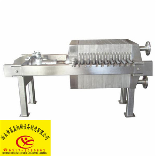 板框壓濾機壓緊方式可分為手動壓緊、液壓壓緊、機械壓緊;《手動壓緊》是利用螺旋千斤頂推動壓緊板壓緊,其利用原理是濾板、濾框排列構成濾室,在輸料泵的壓力作用下,將料液送進更濾室,通過濾布過濾從而達到固液分離;《液壓壓緊》是有液壓站經機架上的液壓缸部件推動壓緊板壓緊;兩橫梁把止推板和壓緊裝置連在一起構成機架,機架上壓緊板與壓緊裝置交接,利用止推板壓緊濾板和濾框,懸浮液從止推板上的進料孔進入各濾室,固體顆粒被過濾介質截留在濾室內,濾液則透過介質,由出液孔排出機外;《機械壓緊》是電動機配減速箱,經機架傳動部件推動壓緊板壓緊。