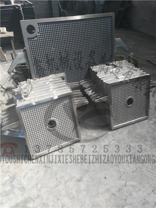 晨鑫牌金屬材質壓濾機濾板框型號有250mm280mm320mm375mm450mm520mm630mm700mm800mm810mm870mm930mm1000mm1250mm1500mm1600mm2000mm等系列(對特殊要求的濾板可按圖紙制作)。壓濾機濾板的表面有麻點和凸臺,用以支撐濾布。濾板的中心和邊角上有通孔,組裝后構成完整的通道,能通入懸浮液、洗滌水和引出濾液。濾板兩側各有把手支托在橫梁上,由壓緊裝置壓緊濾板。濾板之間的濾布起密封作用。
